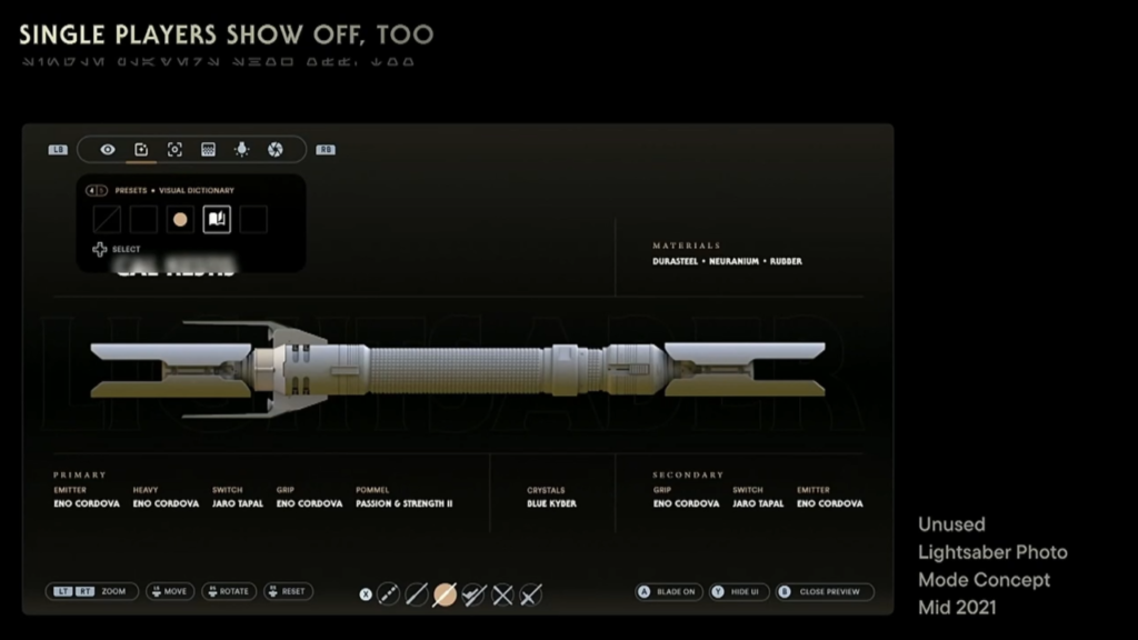 Above is a concept for a Lightsaber photo mode. The development team new players like to show off their Lightsabers on social media following the launch of Jedi Fallen Order. Due this, they looked at making a dedicated Lightsaber showoff mode.